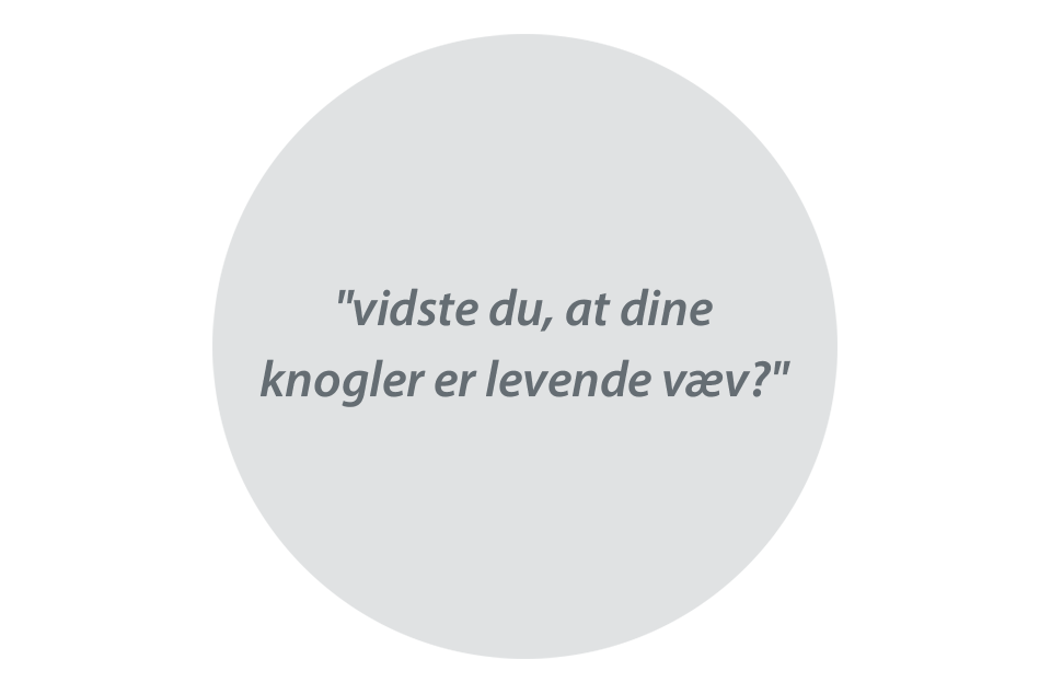 Din krop kan ikke selv producere kalk, så den er helt afhængig af, hvor meget kalk du indtager. Du får kalk gennem din daglige kost, hvor især mælk og mælkeprodukter bidrager. Fundamentet for stærke knogler bliver lagt allerede i barndommen, så kalk er vigtigt hele livet. Vidste du, at dine knogler er levende væv? Helt konkret sker der det, at knoglevævet hele tiden bliver nedbrudt og genopbygget og, hvis du ikke får nok kalk, mangler knoglerne byggesten. Men det er ikke kun knoglerne, der har brug for kalk. Kalk bidrager bl.a. også til normalt energistofskifte, normal størkning af blod, normal muskelfunktion, fordøjelsesenzymernes normale funktion, celledelings- og specialiseringsprocessen, vedligeholdelse af normale tænder – og knogler, hvor kalk hjælper til at begrænse tabet af knoglemineral efter overgangsalderen. Lav knogle-mineraltæthed er en risikofaktor i forhold til knoglebrud som følge af knogleskørhed.