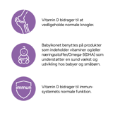 Babyikonet benyttes på produkter som indeholder vitaminer og/eller næringsstoffer/Omega-3(DHA) som understøtter en sund vækst og udvikling hos babyer og småbørn.