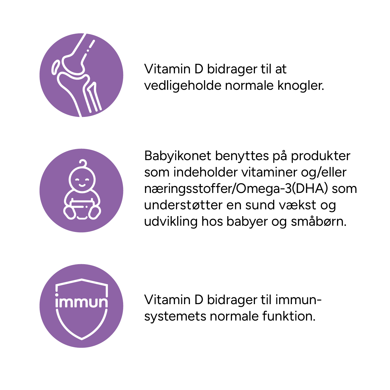 Sundhedsstyrelsen og Fødevarestyrelsen* anbefaler 10 µg D-vitamin i form af dråber til: Alle børn fra 2 uger - 4 år (med mindre de får dækket behovet for D-vitamin gennem modermælkserstatning eller en multivitamintablet).