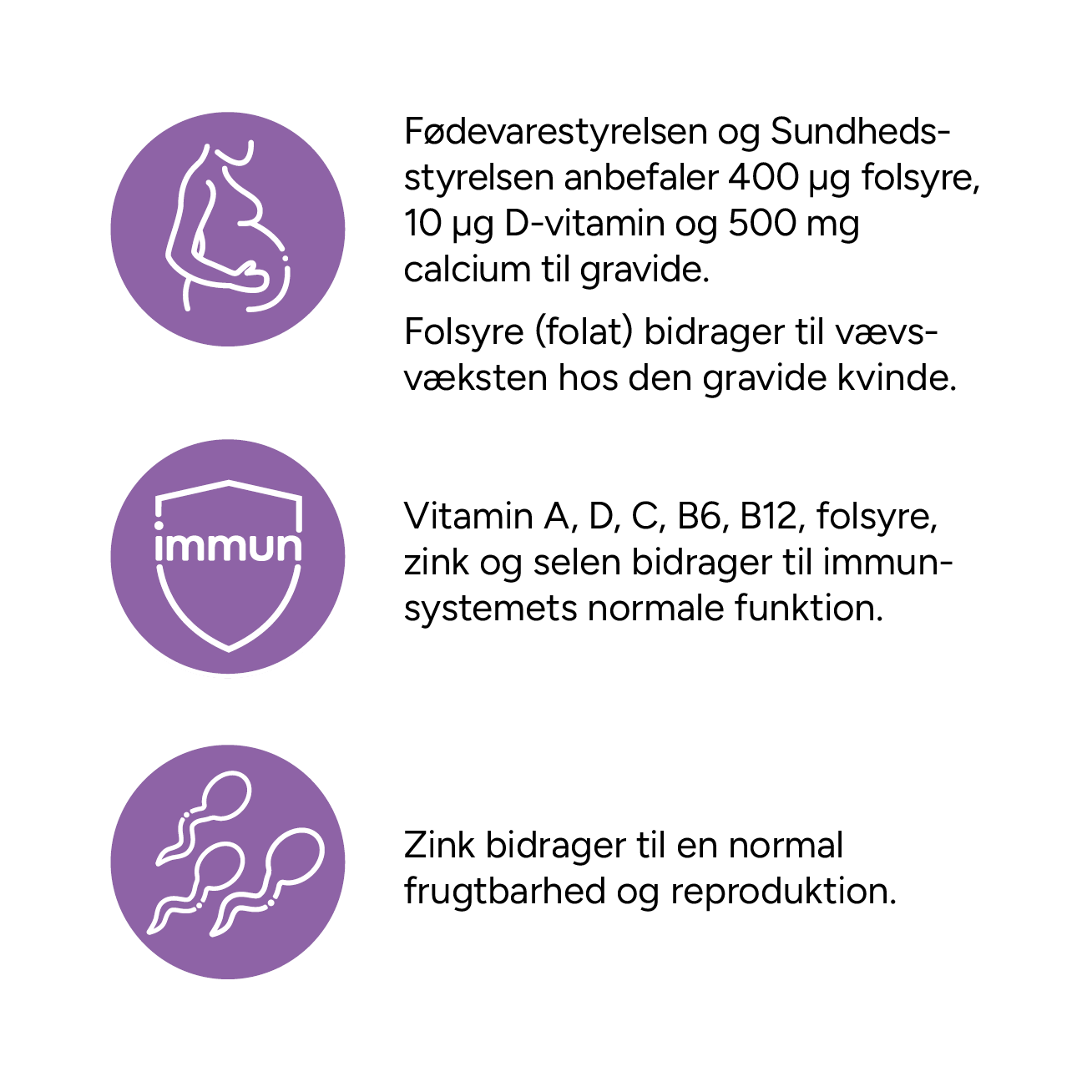 Fødevarestyrelsen og Sundhedsstyrelsen anbefaler 400 µg folsyre, 10 µg D-vitamin og 500 mg calcium til gravide.