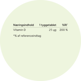 Ingredienser: Fyldemiddel (sorbitol), syre (citronsyre), antiklumpningsmiddel (magnesiumsalte af fedtsyrer), naturlig aroma (appelsin), sødestof (sucralose), farvestof (riboflavin), vitamin D (cholecalciferol).