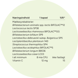 Ingredienser: Mælkesyrebakterier (Bifidobacterium animalis spp. lactis BIFOLAC™12, Lactococcus lactis SP38, Lacticaseibacillus rhamnosus BIFOLAC™GG, Bifidobacterium bifidum SP9, Lactobacillus delbrueckii subsp. Bulgaricus SP5, Lactiplantibacillus plantarum 14D, Streptococcus thermophilus SP4, Lactobacillus acidophilus BIFOLAC™ 5, Bifidobacterium longum BB536, Lacticaseibacillus casei LC03), pregelatineret majsstivelse, majsstivelse, geleringsmidler (hydroxypropylmethylcellulose [kapsel], gellangummi), fructo-oligosaccharider (FOS), vitamin C (L-ascorbinsyre), overfladebehandlingsmiddel (magnesiumsalte af fedtsyrer), antiklumpningsmiddel (siliciumdioxid).