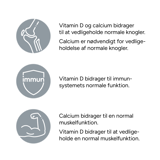 D-vitamin bidrager til normal optagelse/udnyttelse af kalk.