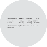 Ingredienser: Calcium (calciumcarbonat) fyldemidler (mikrokrystallinsk cellulose, tværbunden natriumcarboxymethylcellulose), overfladebehandlingsmidler (hydroxypropylmethylcellulose, talkum), antiklumpningsmidler (siliciumdioxid, magnesiumsalte af fedtsyrer), D-vitamin (cholecalciferol).