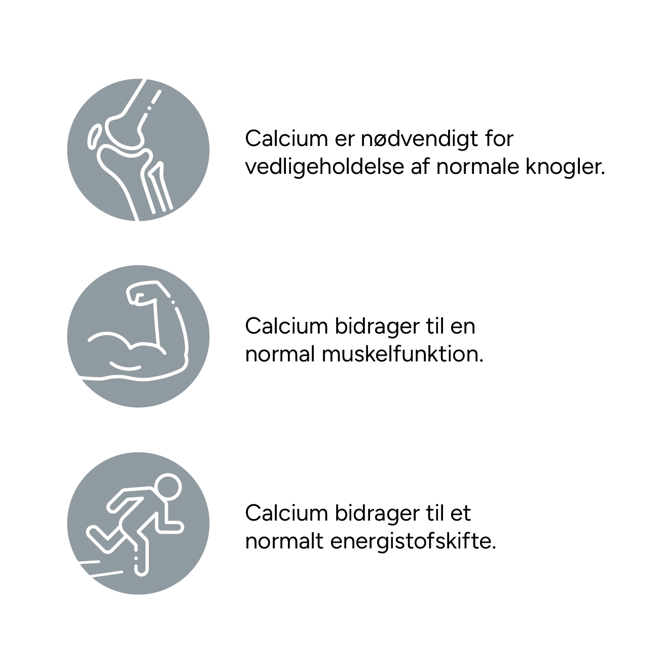 Ingredienser: Calcium (calciumcarbonat) fyldemidler (mikrokrystallinsk cellulose, tværbunden natriumcarboxymethylcellulose), overfladebehandlingsmidler (hydroxypropylmethylcellulose, talkum), antiklumpningsmidler (siliciumdioxid, magnesiumsalte af fedtsyrer), D-vitamin (cholecalciferol).